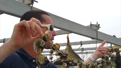 les huîtres sont collées à des cordes fixées aux tables d'élevage.